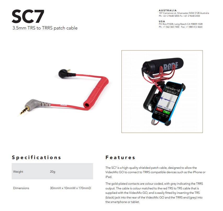 RODE SC7 3.5mm TRS to TRRS Patch Cable Male to Male Camera Mobile Phone Mic Cable Converter Android