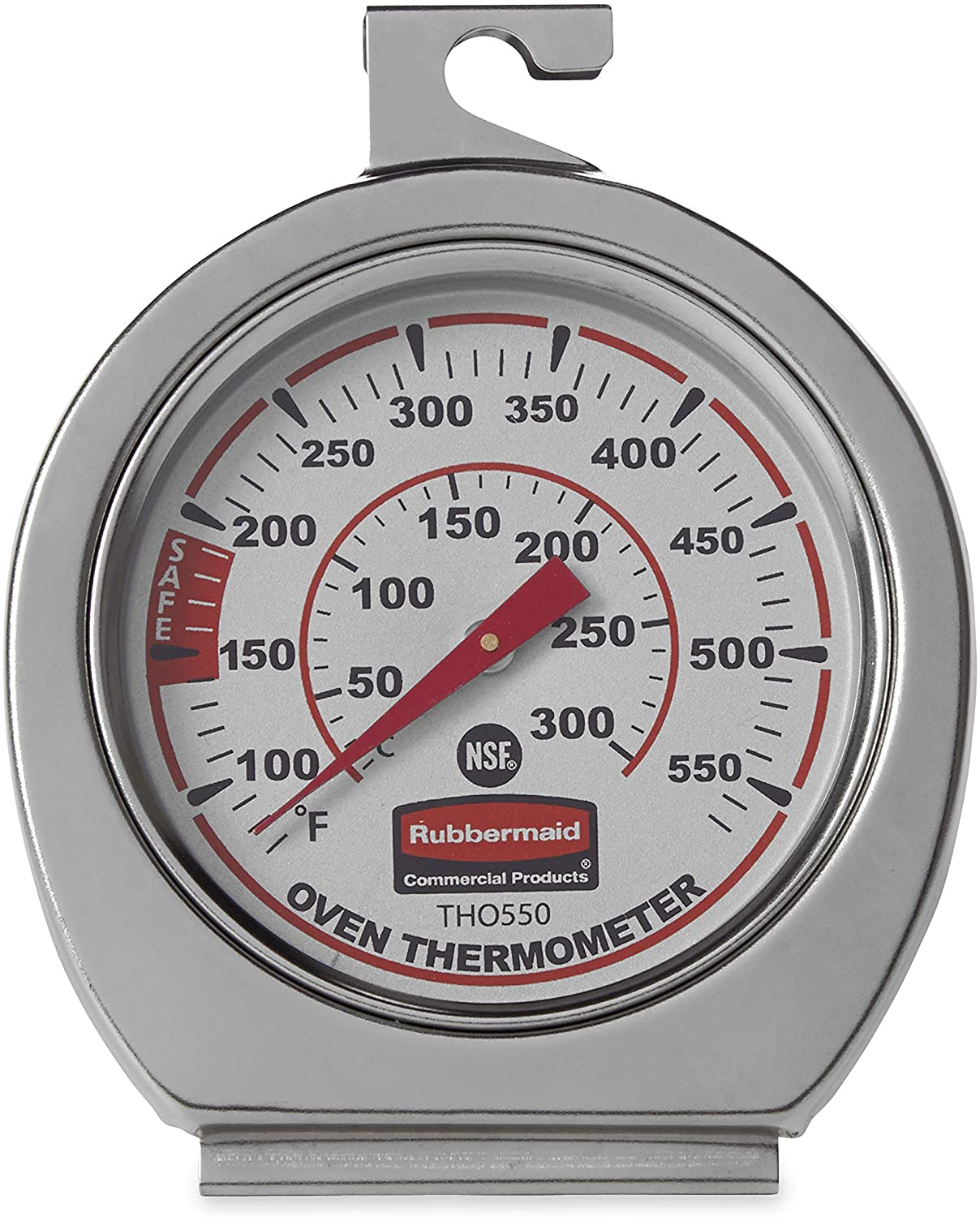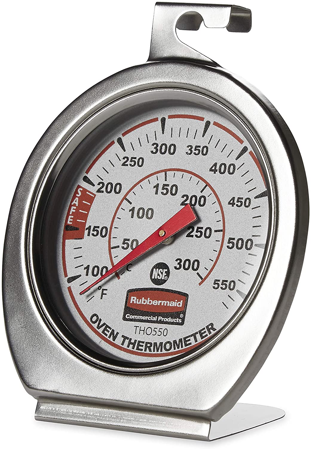 Closely monitor oven temperature with the Rubbermaid Commercial Products Stainless Steel Oven Monitoring Thermometer. Made of durable stainless steel, this thermometer is designed to withstand the rigors of the toughest professional and home kitchens. The scale reads in both Fahrenheit and Celsius, and it features clearly marked increments to facilitate accurate readings. Easy to install, the thermometer can be hung from an oven rack or stood up on a flat surface.