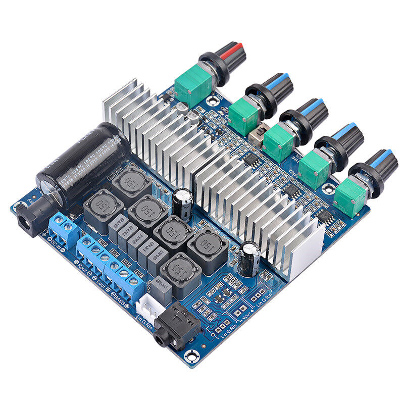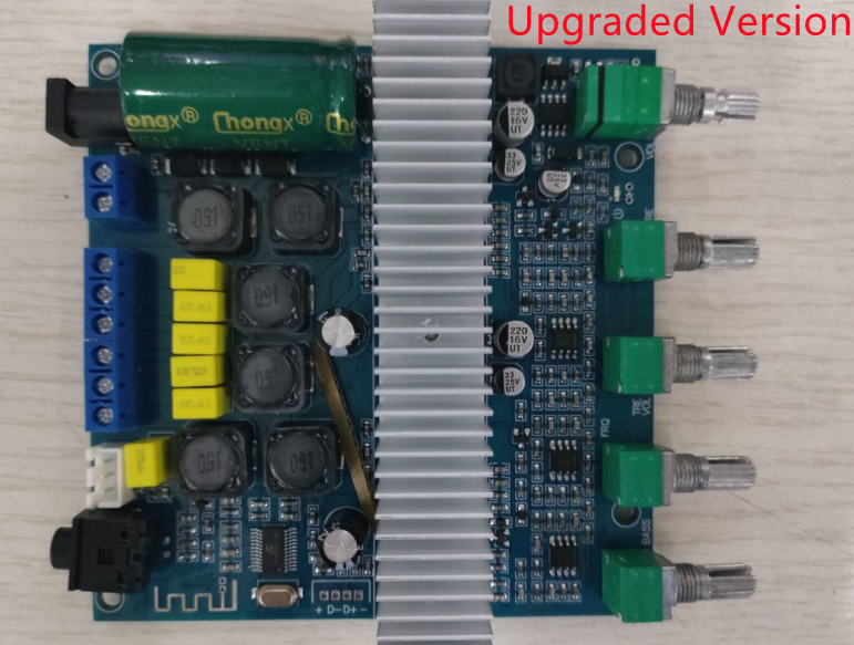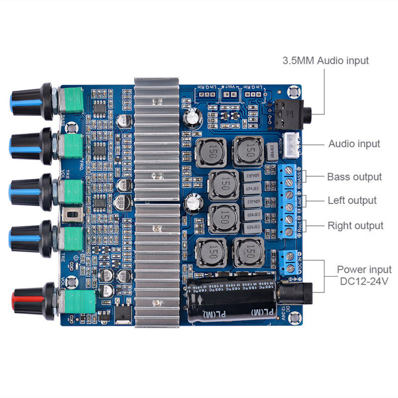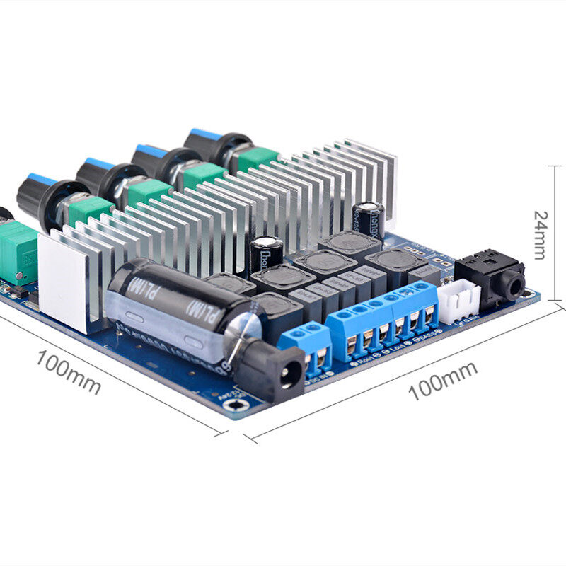 This is a DC-powered 12-24V power supply, using TI’s TPA3116D2 high-performance digital power amplifier chip as the core, one for the parallel bridge type bass channel power amplifier output, and the other for the left and right channel power amplifier output. Support 100W (bass sound Channel) +50W (left channel) +50W (right channel) three-channel output.