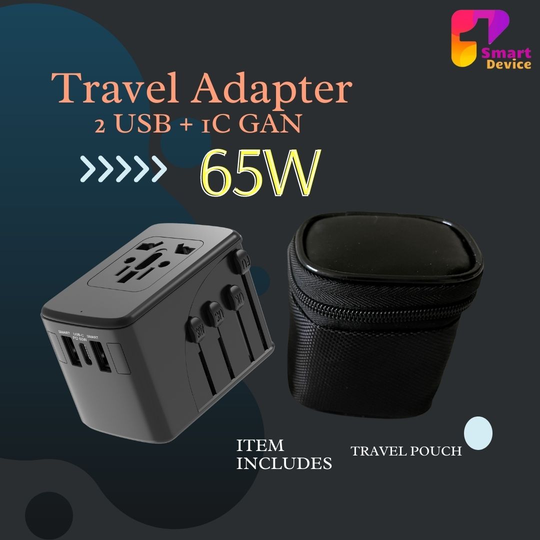 65W Universal Travel Adapter - GaN Type-C Charger, 2USB-A & 1 USB-C PD Fast Charge