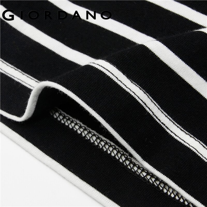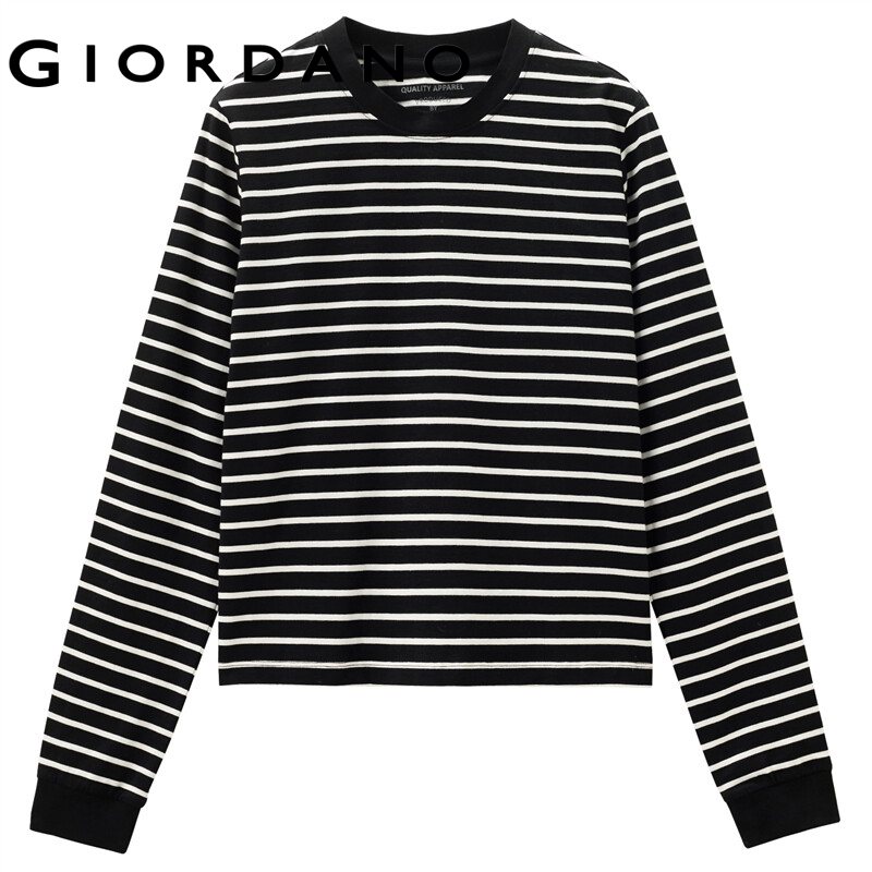 GIORDANO Women T-Shirts Long Sleeve Ribbed Crewneck Casual T-Shirts 100% Cotton Contrast Color Stripe Relaxed Comfy Tee 05322790