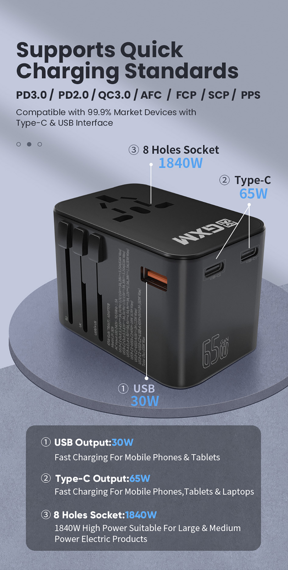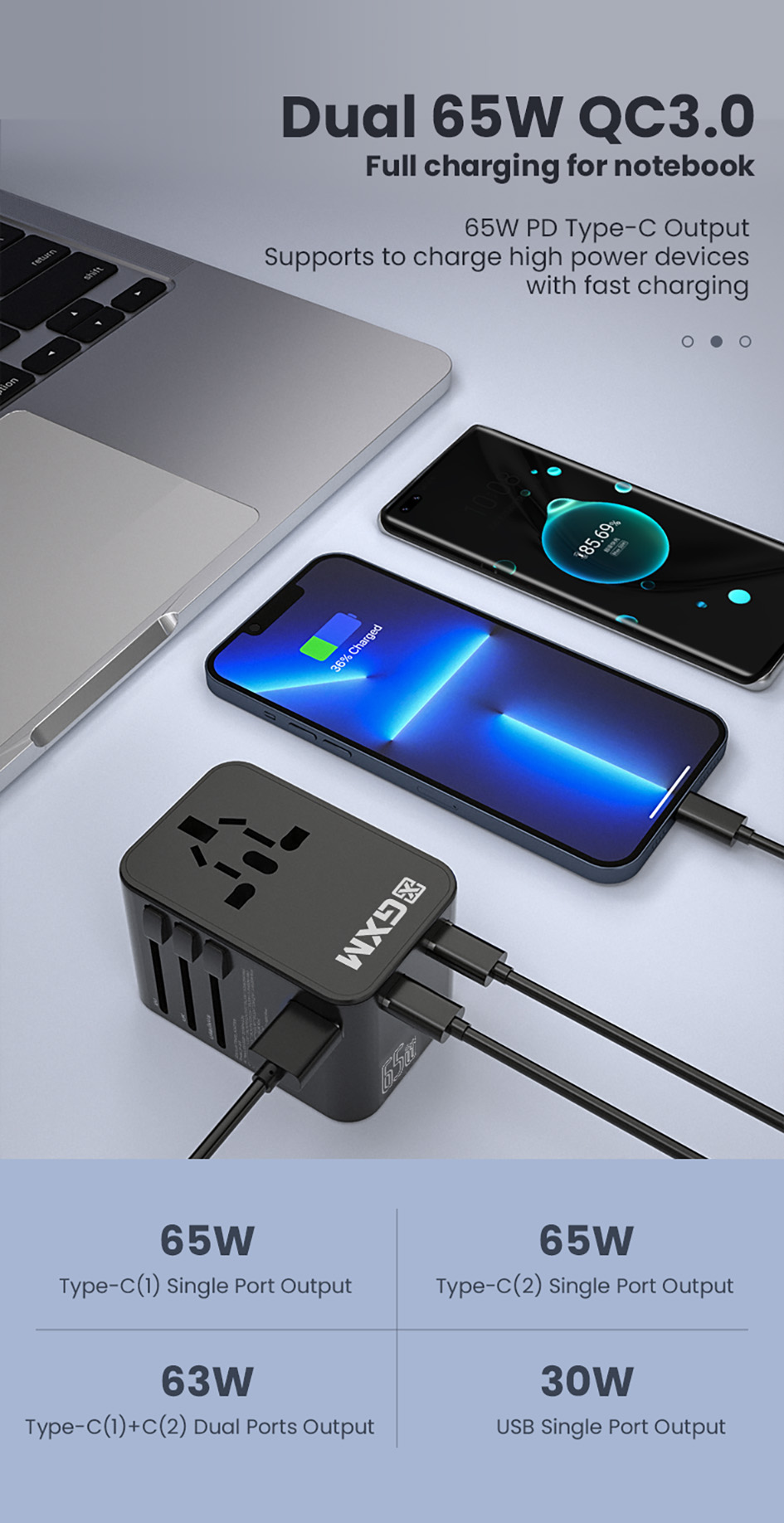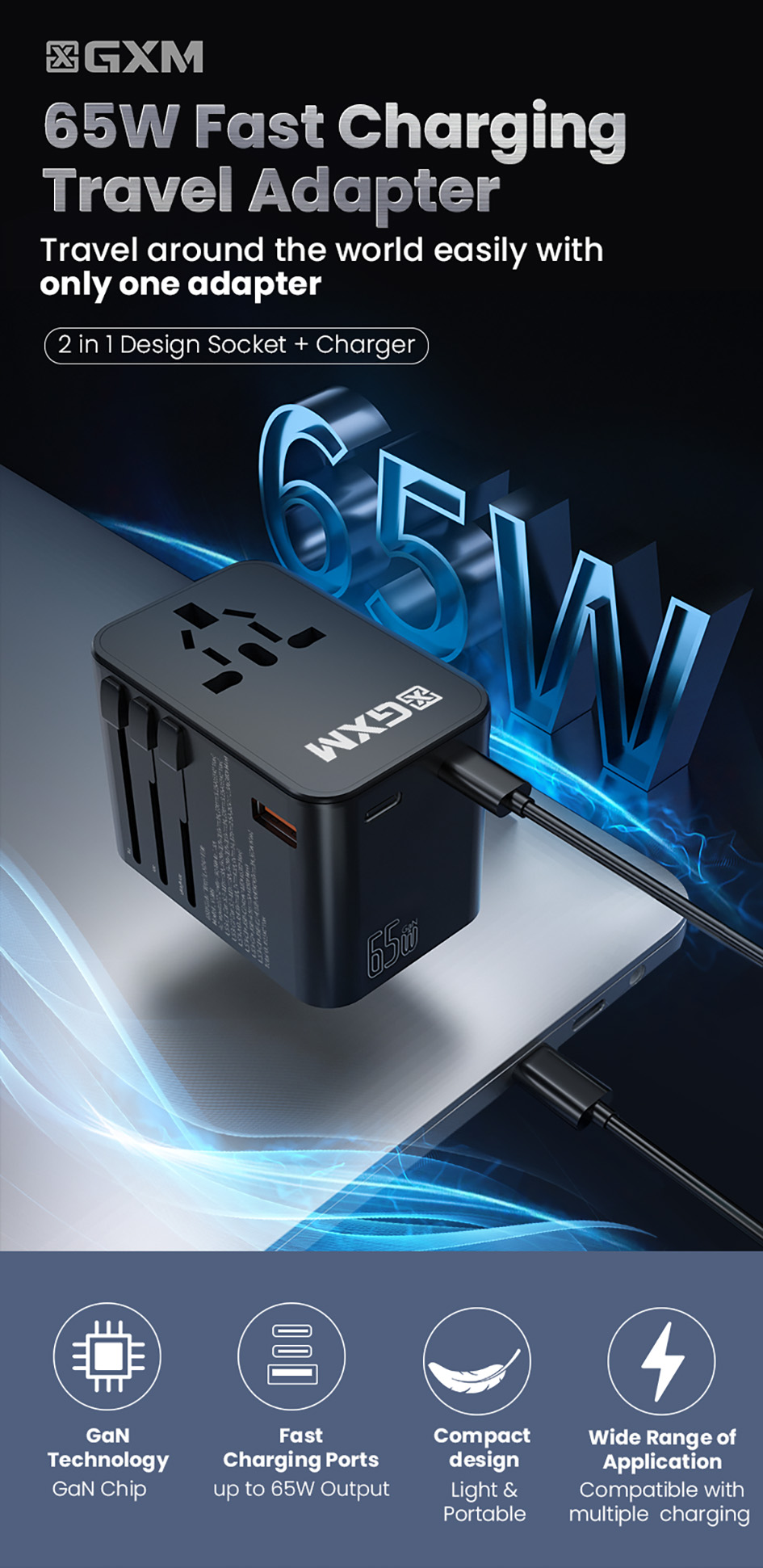 GXM 65W Travel Adapter GaN Wall Charger Fast Charge PD QC Type C USB C EU US UK AU Plug Socket Over 150 Countries Universal Travel Power Charger