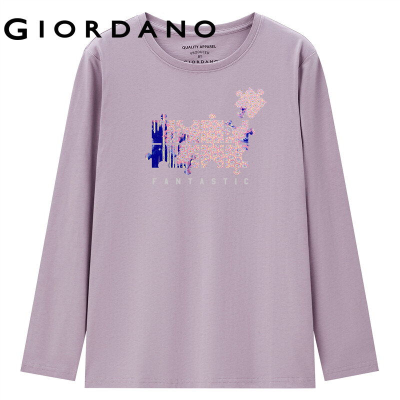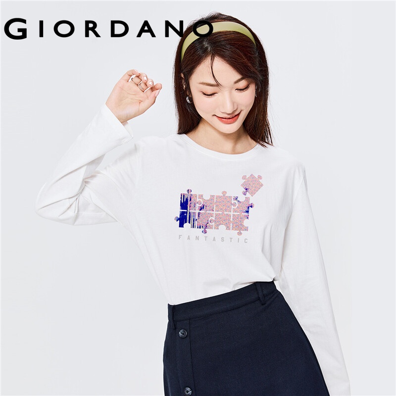 GIORDANO Women Huangshouyi Series T-Shirts Print Graphic Crewneck Simple Tee 100% Cotton Long Sleeve Casaul T-Shirts 99392152