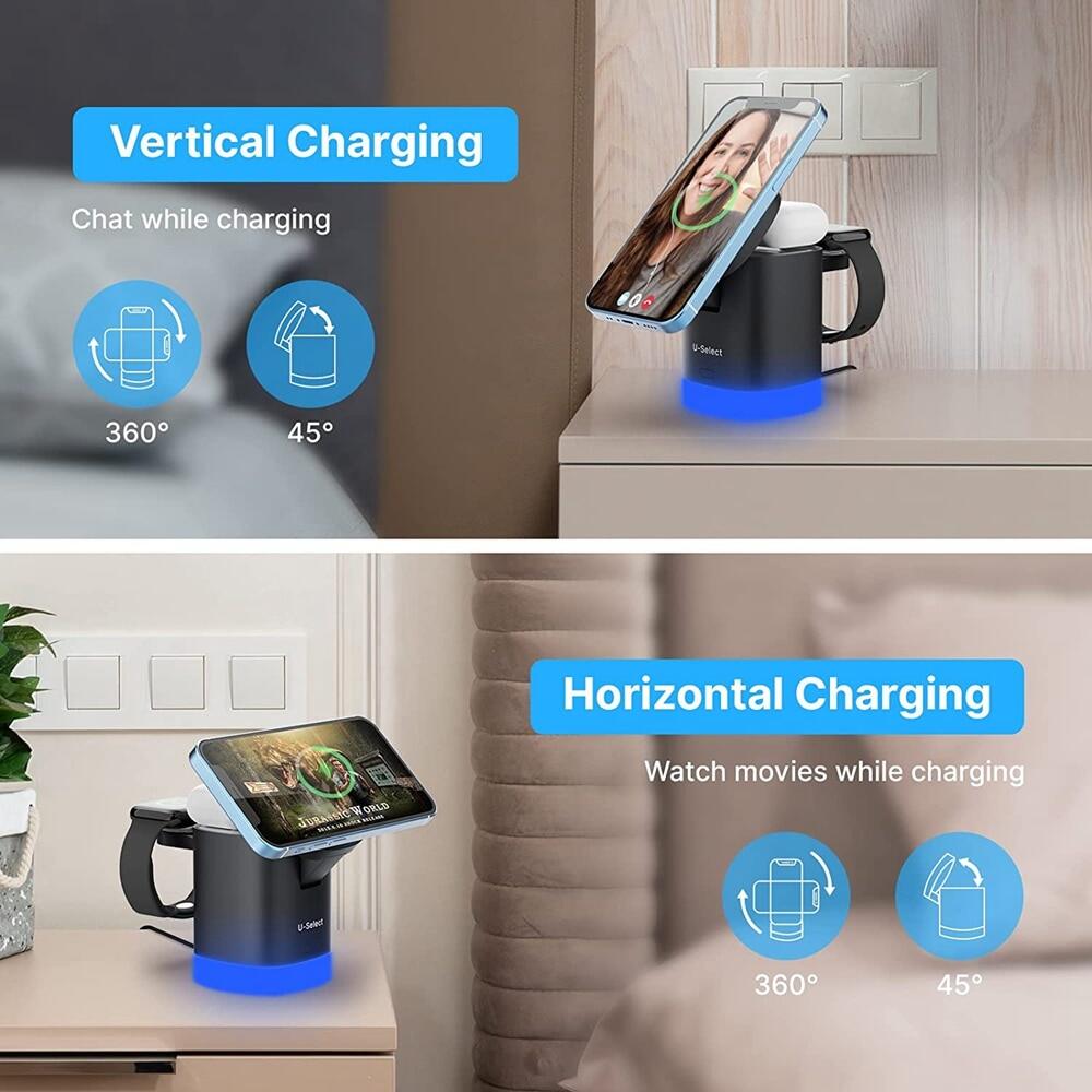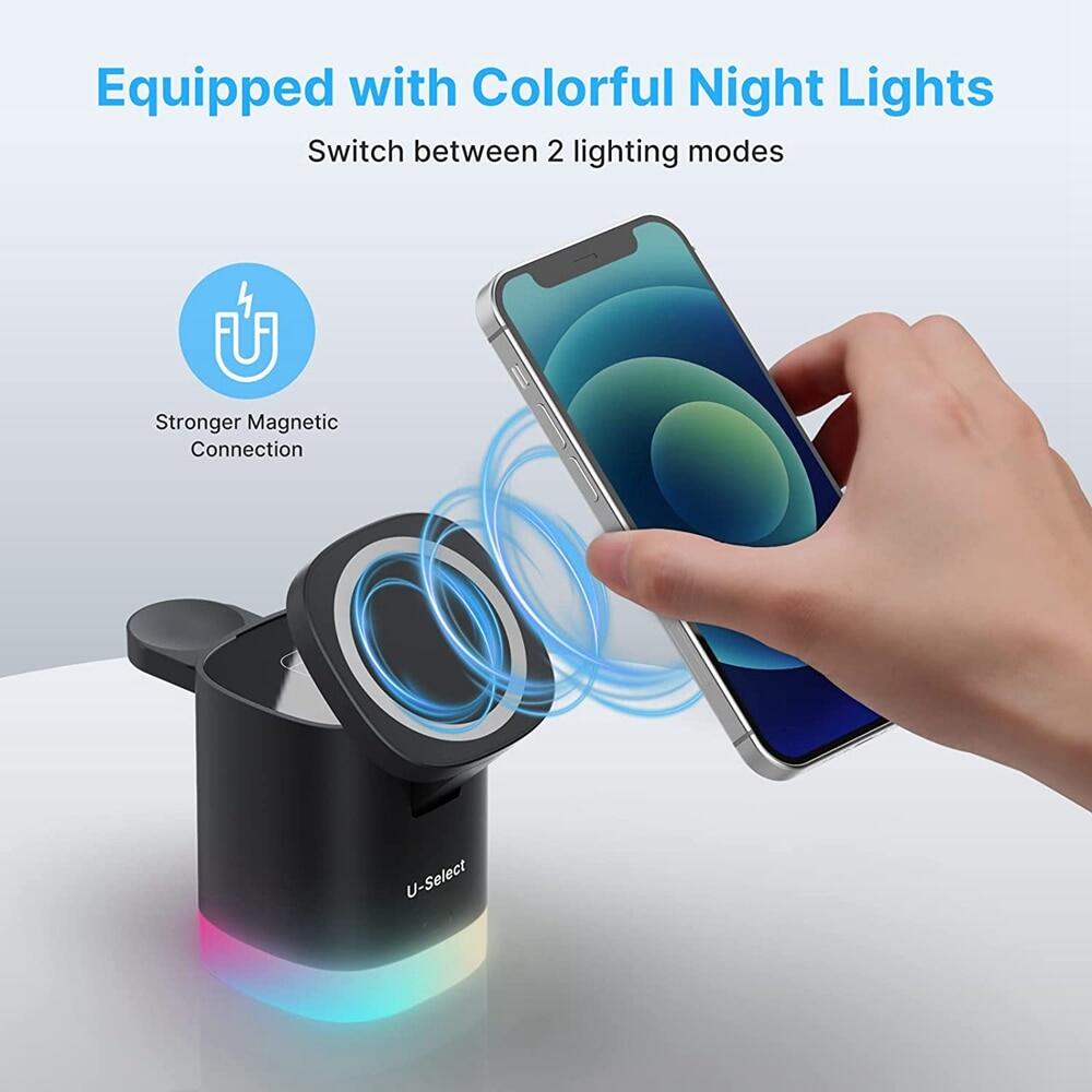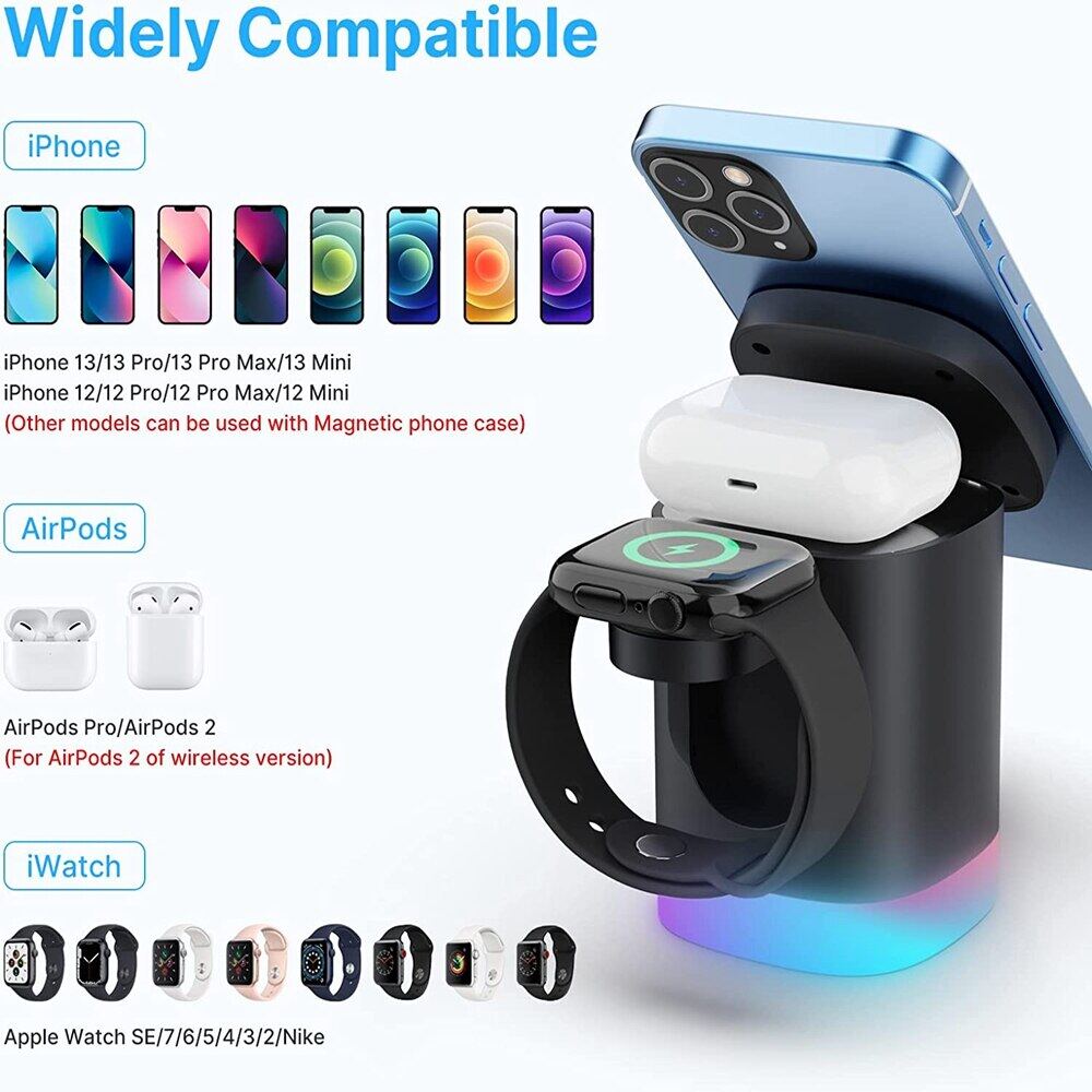 HOCE 15W 3 in 1 Magnetic Wireless Charger Foldable Stand Dock for iPhone 14 13 12 Pro Max Fast Charging Station for Apple Watch 8 7 6 5 AirPod Pro 2 RGB Lamp